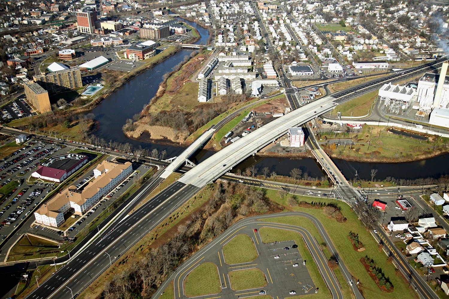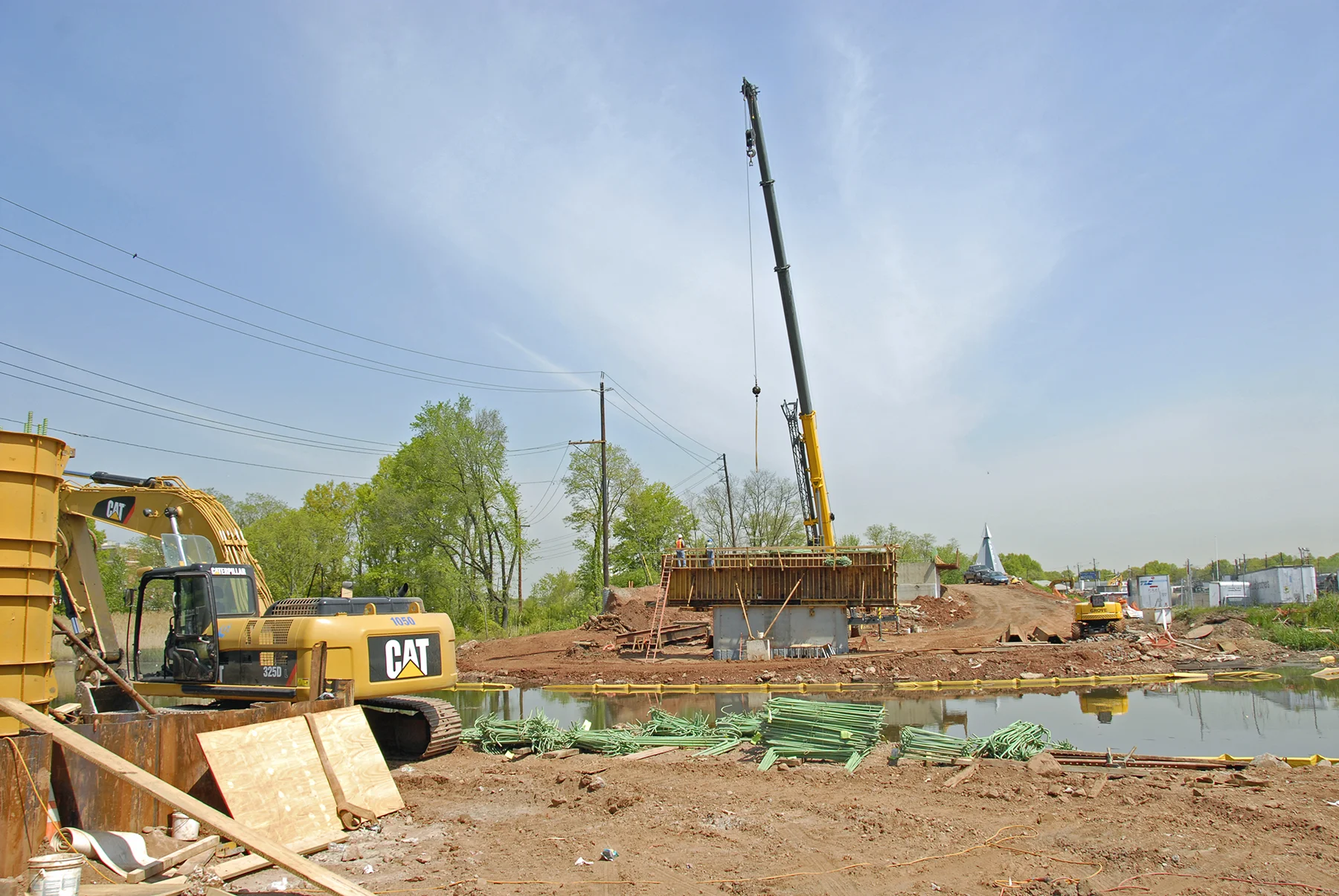 Union Paving constructed a new 1,000-foot-long bridge and related roadways to realign Rt. 1&9 over local roads and the Rahway River. The work included nine piers, two of which were located in the river. To build the two footings in the river, we installed two cofferdams approximately 40’ x 100’ and dewatered with pumps into a sediment/retention basin.